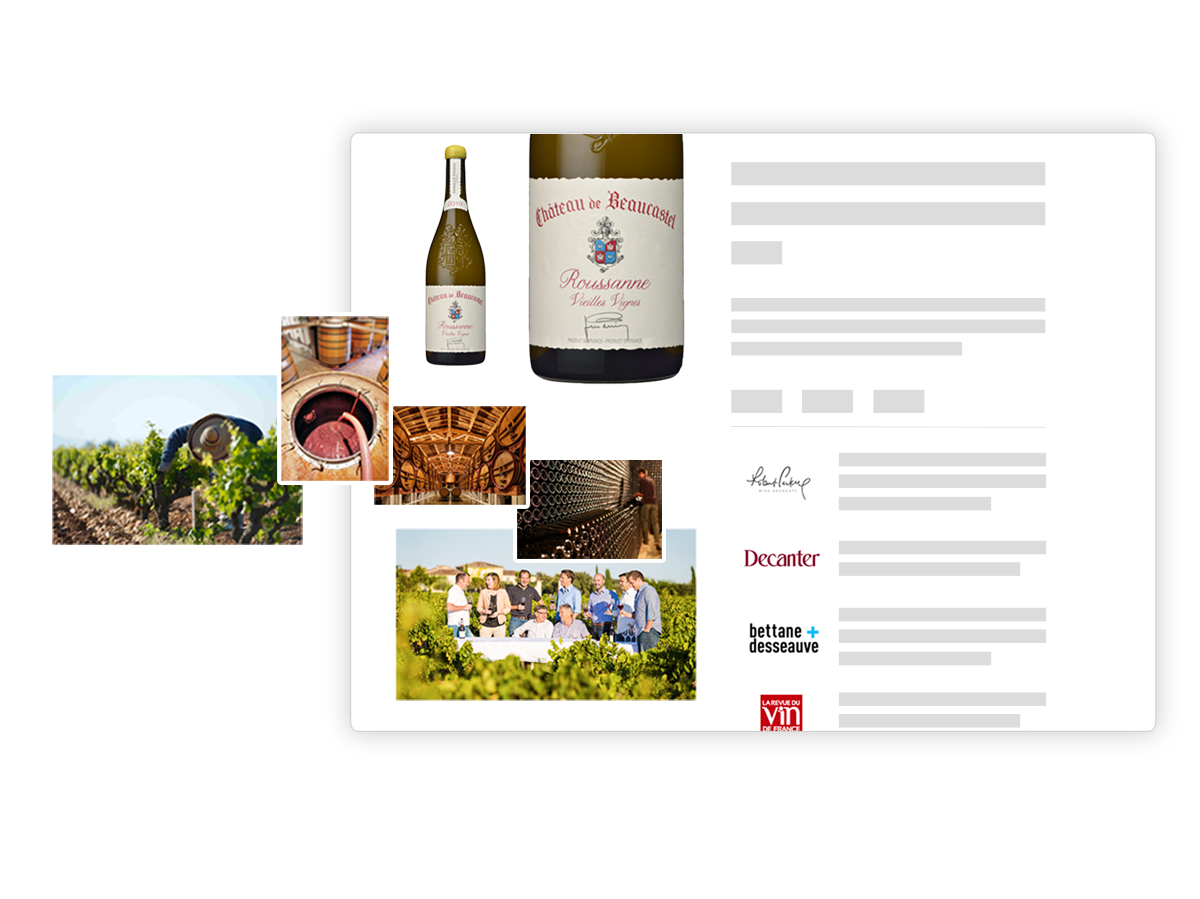 vin.co propose le référentiel produits du terroir le plus complet du marché : de l'authentification de l'appellation aux déclarations nutritionnelles en passant par la décomposition des éléments de présentation et de conseils, et allant même jusqu'aux données logistiques.