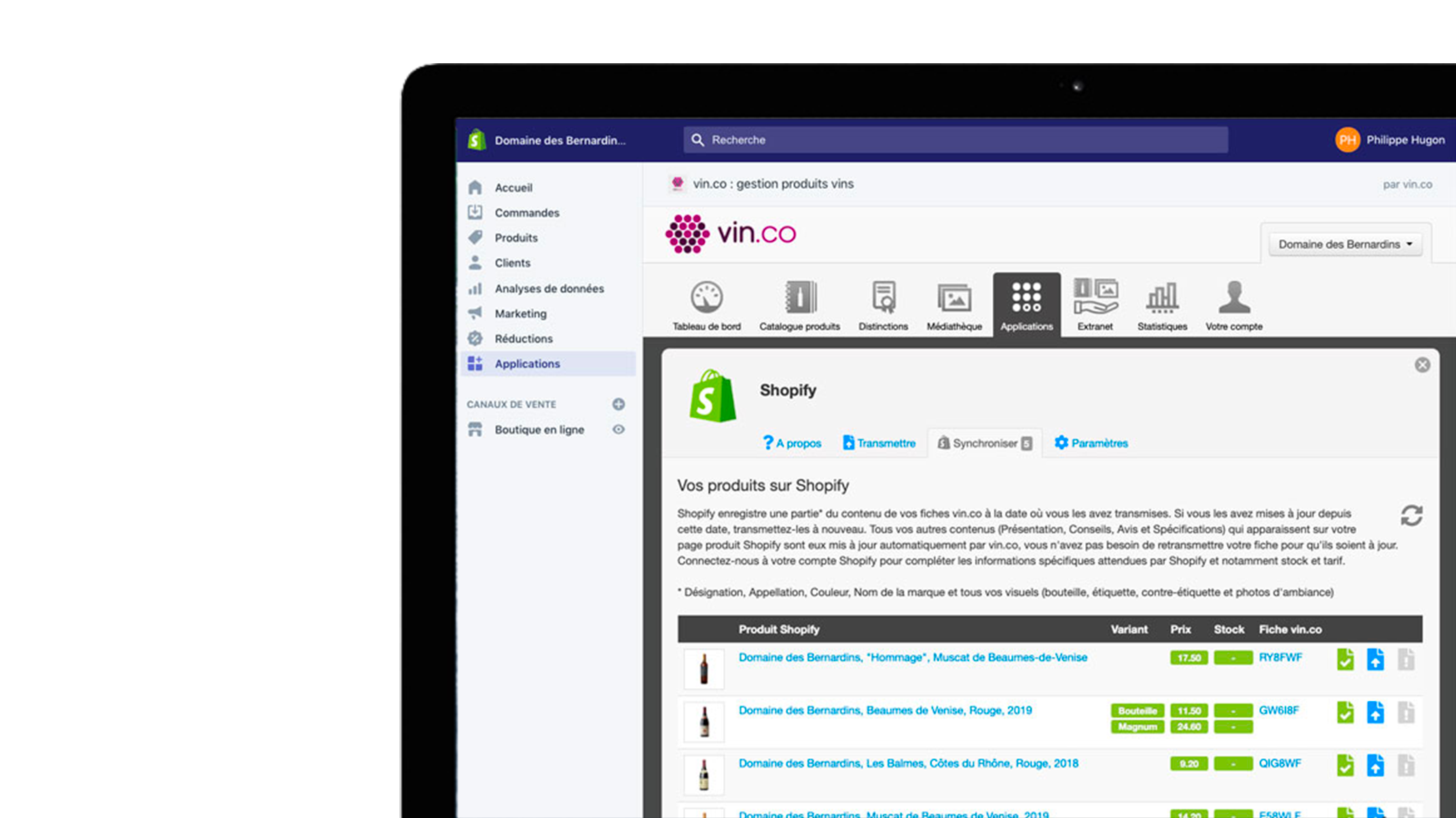 L'application vin.co : pages produits vins vous permet de synchroniser votre catalogue vin.co avec votre boutique Shopify. Une fois l'application installée : sélectionnez un produit de votre catalogue, cliquez sur Transmettre et le voilà automatiquement créé sur votre boutique.