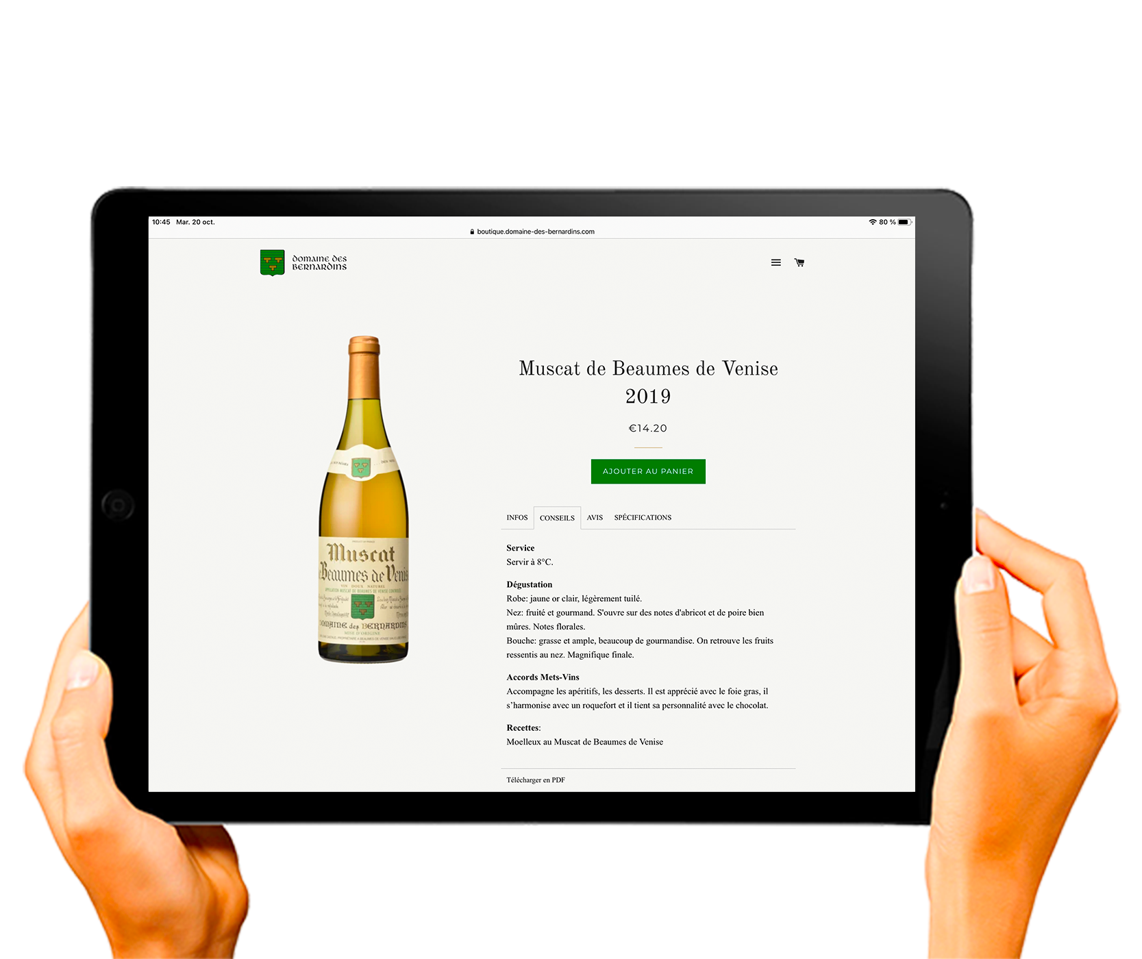 Nous les avons spécialement designées pour s'intégrer à votre thème et magnifier la présentation de vos vins : packshot, photos d'ambiance, présentation détaillée, conseils de dégustation, revue de presse, médailles, certifications, mais aussi toutes les informations légales de vente.